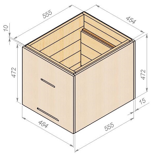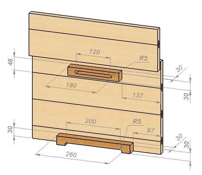 Изготавливается по аналогии с задней стенкой. К ней прикрепим деревянные бруски, размеры которых и их место расположение показано на рисунке